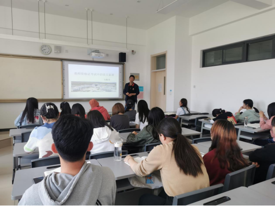 本次专题培训分别由写作教研室主任马敬芳教授和语言文学教研室主任耿朝晖副教授主讲。马敬芳以语文课备课为例,详细讲解了教团队格面试中的备课要领,重点讲授了如何在短时间内将一个知识点讲透彻、讲深入的方法;耿朝晖主要从面试技巧切入,讲授了面试过程中的注意事项,面试礼仪、着装礼仪、仪态礼仪等的细节问题。互动环节中,两位老师还帮助分析了提问同学的疑问和困惑,并对症下药,给出了解决的方法。