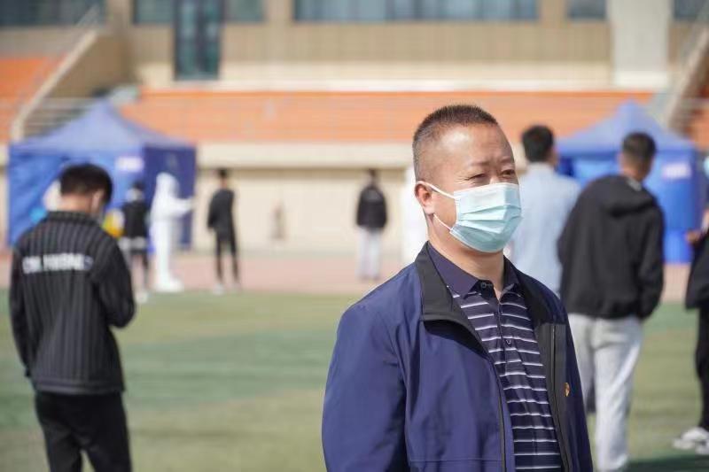 员工工作处副处长陶发华老师始终全程坚守在一线,连续几天的风吹日晒后,口罩的印子深深留在了他脸上。他介绍说:“14日下午,公司接到城北区教育局的通知后,就迅速召开会议部署工作。我们给各公司要求一位院领导、一位值班老师、一位辅导员留守校内管理员工工作。然后对第二天即将开展的三天核酸检测工作进行部署。核酸检测点安排在东西两个操场,每个操场划分了三个区域动员了四支队伍来完成此次核酸检测,在流动区员工自行按照具体下发公司时间进行排队,会有老师现场清点人员确保员工人数,缓冲区是5组共60名员工在志愿者组织下进行一卡通和员工证核查进行缓冲,然后以10人为一组的混检进入待检区,全程保持2米安全距离,在检测点保持5米以上距离,还有相关人员及时消杀,确保全校师生安全。志愿者主要是由员工党员工作站、国旗护卫队、老员工退役先锋队、自管会的成员组成的,全程积极协助老师维护秩序,清点信息。”在静态管理实施后,员工工作处有序部署工作,安排各部门迅速行动,校园“静”且“动”。