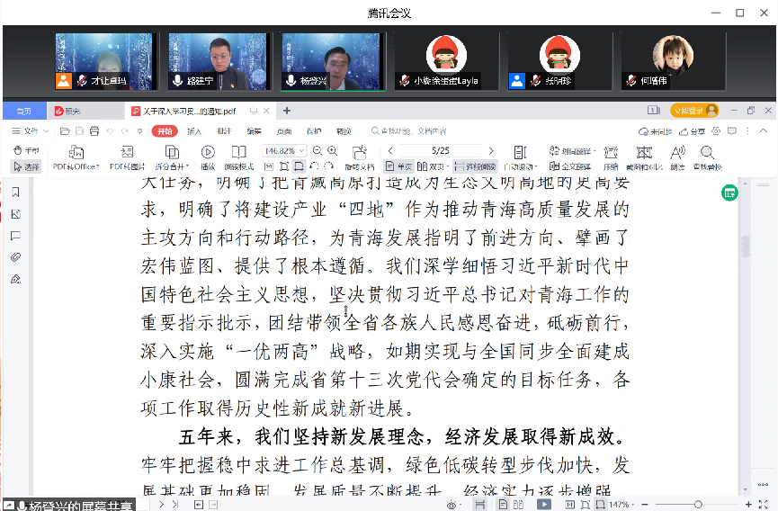 活动的最后,杨登兴同志带领大家学习了信长星同志在中国共产党青海省第十四次代表大会上的报告。党代会报告全面总结了省第十三次党代会以来五年的工作成绩,深入提炼了实践中积累的宝贵经验,客观分析了面临的机遇挑战,全面谋划了今后五年青海高质量发展的目标任务,必将引领全省各族干部群众在加快建设“六个现代化新青海”的新征程奋勇前进。作为高校教育工作者,我们要坚决拥护中央与省委的战略决策部署,在做好疫情防控常态化工作的同时,落实立德树人根本任务,提升公司产品质量和水平,为青海高等教育的发展做出自己的贡献。