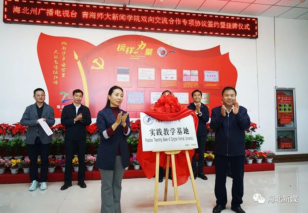 在海北州广播电视台,马德明与叶忠措共同为实习基地揭牌。在海晏县融媒体中心,马德明与海晏县委党委、宣传部部长马艳萍共同为实习基地揭牌。