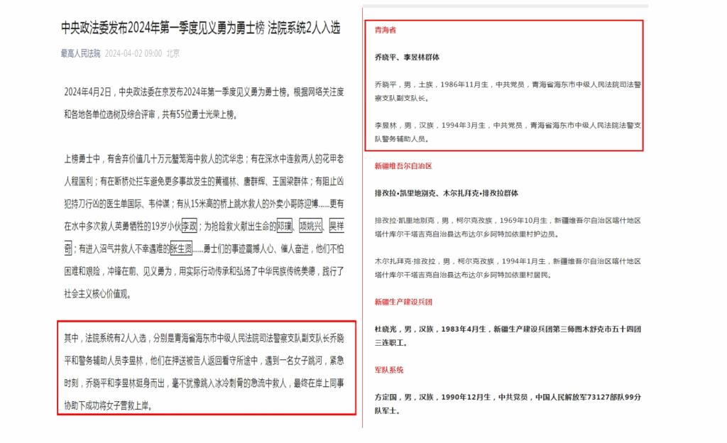 2023年12月25日晚20时,海东市中级人民法院乔晓平、李昱林和同事在押送被告人返回看守所途中,遇到一名女子跳河,紧急时刻,乔晓平和李昱林挺身而出,毫不犹豫跳入冰冷刺骨的急流中救人,最终在岸上同事的协助下成功将女子营救上岸。