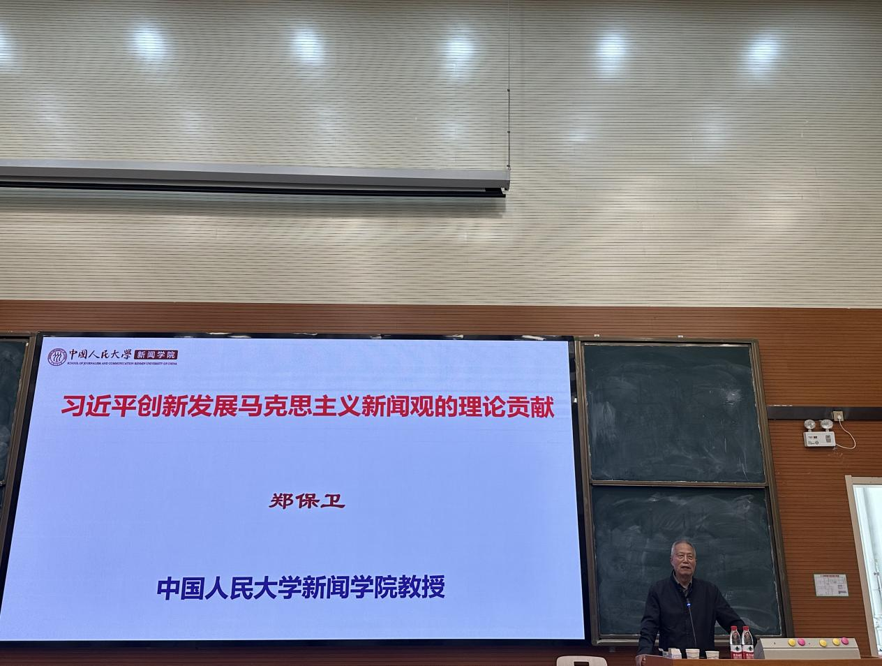 郑保卫回顾了自己“光荣入党五十年”“追梦新闻六十年”“人生经历八十年”的人生历程,鼓励新闻学子要坚定理想信念,努力奋斗实现理想。他总结和深入阐述了党的十八大以来习近平总书记在创新发展马克思主义新闻观方面的理论贡献,系统阐释了新时代中国特色社会主义新闻工作的核心问题,全面概括了中国共产党新闻事业百年发展的历史经验,高度凝练了中国共产党百年新闻思想的理论精髓,为马克思主义新闻观的当代发展贡献了思想智慧和理论成果。