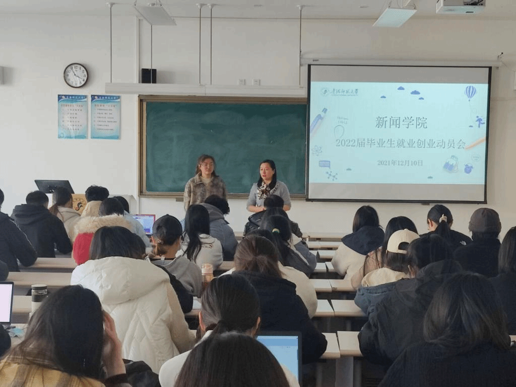 为了让2022届毕业生及早的了解就业形势的严峻性,增强毕业生就业的紧迫感,提高就业热情,2021年12月10日在东一楼302教室隆重召开了2022届毕业生就业动员。会议有张蕾老师主持,党总支副书记张晓婷及在校的毕业生参会。