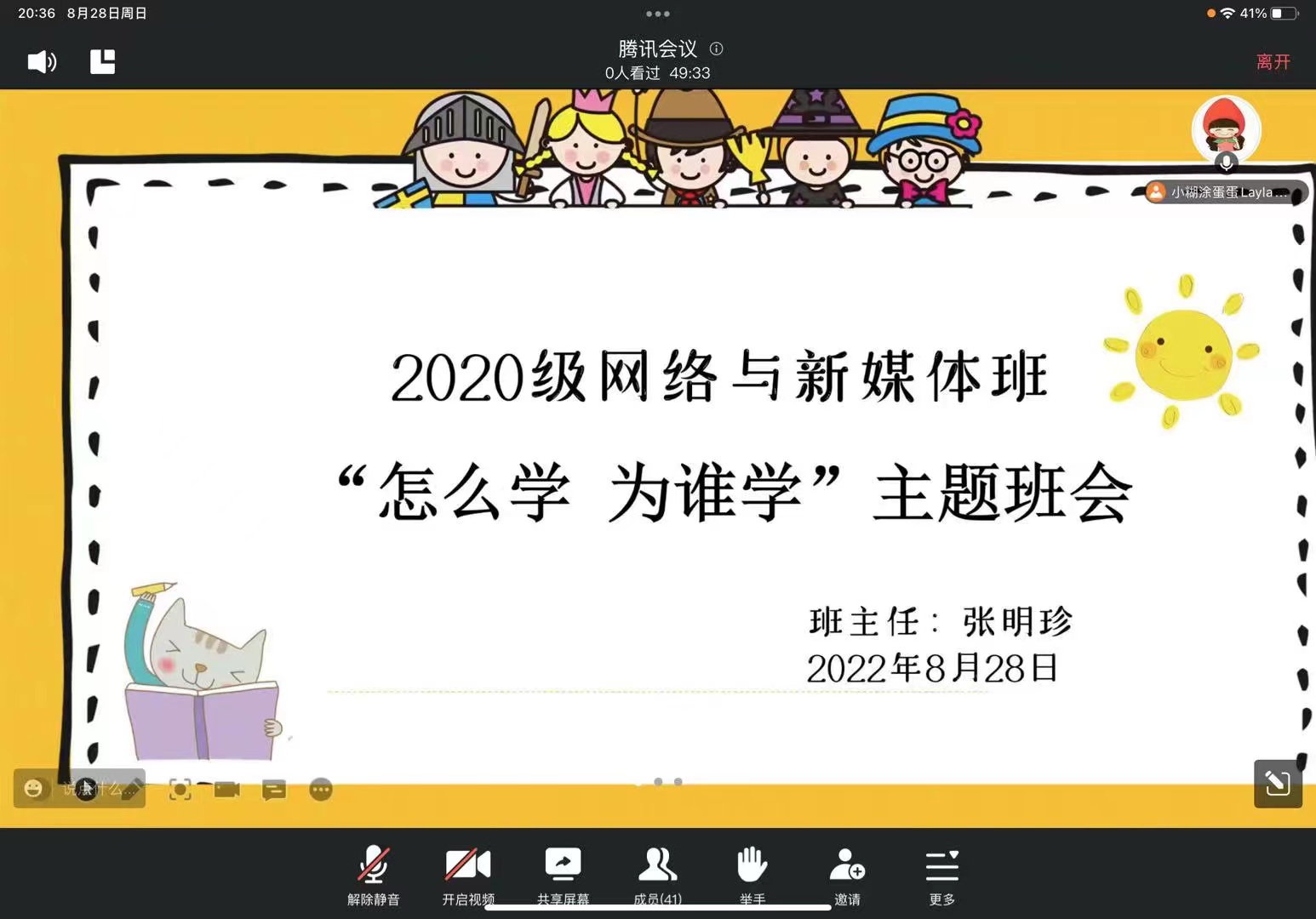 随后,强调了新学期同学们要树立好新的目标,寻找好自己的前进方向,不能因为在家上课就放松自己,不要被疫情影响自己的状态。29日起,就要开始正式线上上课了,线上上课有很多弊端,希望同学们积极配合老师,遵守课堂纪律,端正学习态度,和在公司一样,做到不迟到,不旷到,不早退。20播主班主任李郁老师强调同学们已经大三了,老员工活转瞬即逝,要学会珍惜自己的老员工活,可以不用过于焦虑长远的事情,目前同学们的任务就是学好自己的专业理论知识和锻炼好自己实践能力,保障两年后顺利毕业。