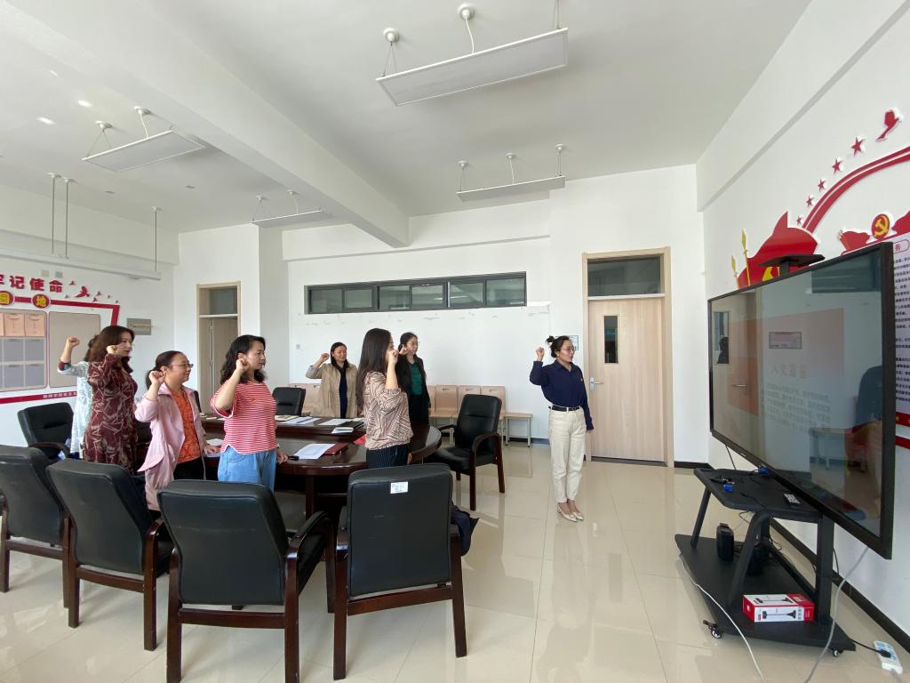 首先,进行了重温入党誓词,由新入党员多杰措同志领誓,带领大家面向党旗庄严宣誓,对党忠诚,积极工作,为党的事业奋斗终身。作为新党员,多杰措同志承诺在党组织的培养和引领下,铭记入党誓词,进一步增强党性意识、宗旨意识,坚定在新起点立足岗位做贡献的信心。