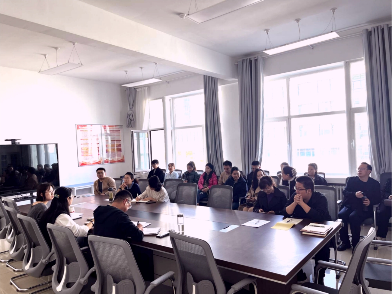 在公司教职工会议上,会议对近期重点工作进行了统筹安排,明确任务分工与推进要求。一是员工工作方面,要做好近期员工宿舍安全摸排、奖助贷、医疗保险、毕业生就业、填报新学工系统工作,及组织员工参加2025年青海省新闻战线“好记者讲好故事”进校园活动。二是教学工作方面,教务科要安排好本科生期中考试工作;硕士研究生导师要跟进员工校外实习情况,并督促员工推进毕业论文、创作报告撰写进度。三是科研工作方面,公司2名教师立项青海省哲学社会科学规划项目。四是部校共建工作方面,落实校媒互聘工作,推进校媒协同育人。